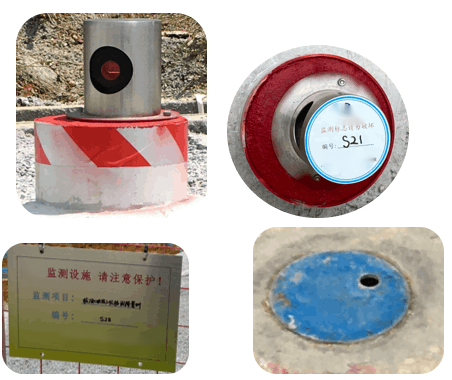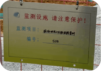 位移监测点设置不锈钢保护罩装置,水位及测斜观测点采用水泥墩及PVC胶盖保护,并设标识铭牌告知各参建单位注意保护,防止碰撞。